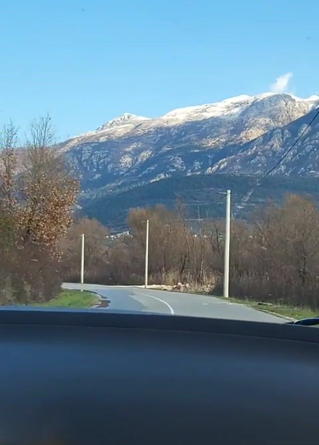 view from inside a car driving on a road. The road winds through a landscape of bare trees and bushes. In the distance, a large mountain range is visible, with some snow on its peaks. The sky is blue with a few scattered clouds. Power lines run along the side of the road. The interior of the car, including the dashboard, is visible in the foreground. A furry animal pops into view in the frame briefly.