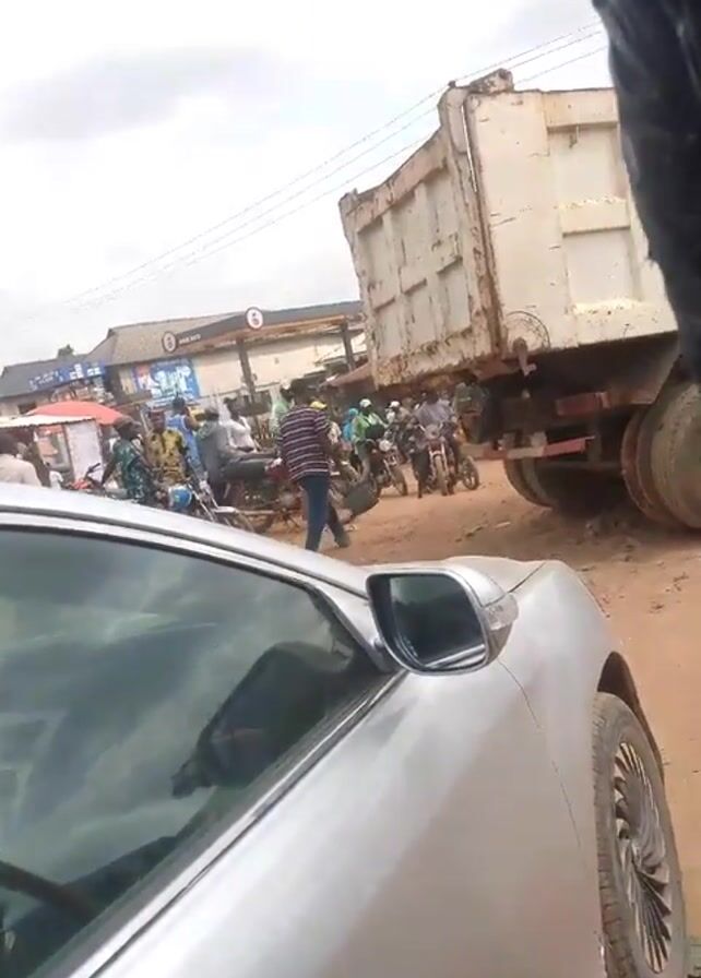 street scene with a large white dump truck, several people on motorcycles, and a silver car