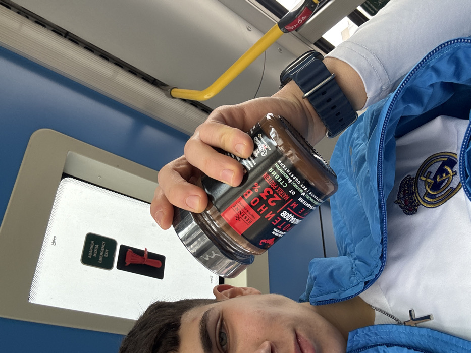 An upward-angled image depicts a male individual inside a public transport vehicle in Varna, Bulgaria. The subject, partially visible in the lower-left, has short dark hair and blue-green eyes. He wears a light blue puffer jacket over a white shirt featuring a Real Madrid crest, and a silver cross pendant. His left hand, adorned with a dark blue-strapped watch, holds a clear glass jar containing brown protein chocolate spread. The jar's label displays "SISINNI ПРОТЕИНОВ ШОКОЛАДОВ КРЕМ" (Protein Chocolate Cream), "MATRIX PROTEIN 23%", and "ОТ СТЕВИЯ" (from Stevia). The background reveals the vehicle's interior: a light blue ceiling, a yellow curved grab bar, and through a window/skylight, a white panel with a green "АВАРИЕН ИЗХОД / EMERGENCY EXIT" sign and a red emergency hammer.