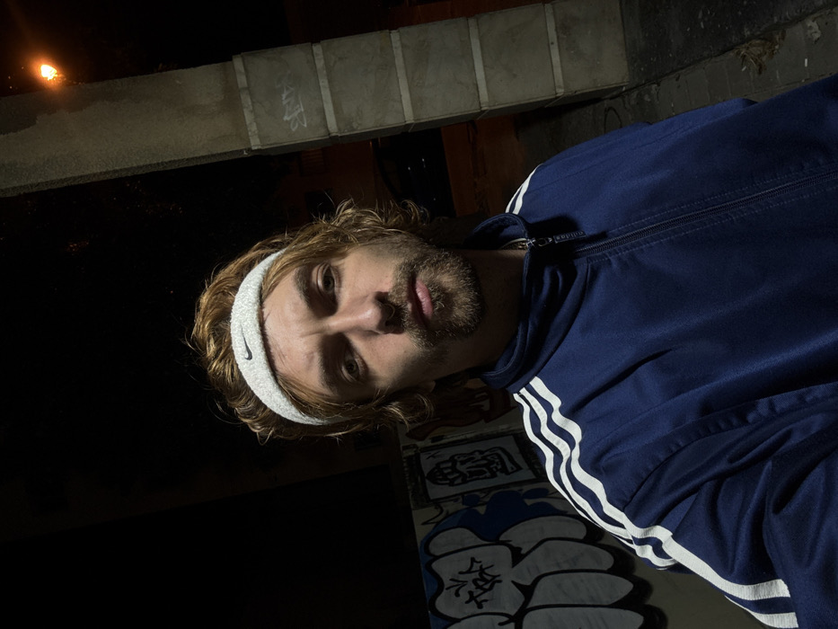 A man with long blond hair and a short beard is wearing a white Nike headband and a blue Adidas track jacket with white stripes. The background appears to be an urban setting at night, with a dim light source visible in the upper left corner. There's also some graffiti on a wall behind and to the side of the man. The image is composed in a slightly tilted, low-angle shot.