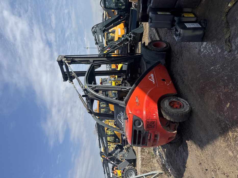 The image depicts an outdoor industrial or commercial yard located in German, Bulgaria. A red Linde forklift, facing right and slightly angled, occupies the foreground. The forklift's front displays "Linde" branding and a square QR code sticker on the left side. Its tires are soiled with mud. To the right of the forklift, a cluster of black plastic jerrycans is stacked on the ground, with one lying on its side next to a dark, oily rag. The ground throughout the scene is uneven, muddy, and appears wet in places. In the background, several heavy construction vehicles are parked, primarily black and yellow excavators and wheel loaders, many bearing "HYUNDAI" branding. The sky above is clear blue with scattered white clouds, indicating daylight conditions. No individuals are present in the scene.