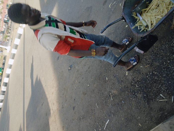 An adult male walks on an asphalt road in an urban area of Unknown, Unknown, pushing a dark-colored wheelbarrow. The wheelbarrow is filled with light-colored, elongated plant material, consistent with peeled sugarcane, alongside a small knife or peeler. The male has dark skin, short dark hair, and wears a striped collared shirt, an off-white and red sleeveless jacket, light blue denim trousers, and black slide sandals. Golden beaded bracelets are visible on his left wrist. The asphalt road is marked by cracks and scattered with similar plant debris. In the background, a paved area with black and white striped curbs, indistinct urban structures, and a light green three-wheeled vehicle are visible under daylight conditions, casting shadows.