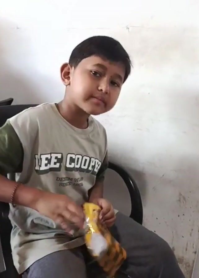 A boy is sitting in a black office chair, opening a bag of Pillow Waffles. He is wearing a grey and green "Lee Cooper" t-shirt and grey pants. The background is a plain, off-white wall. He looks at the camera and says something, then looks to the side, and finally addresses the camera again.