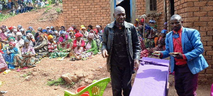 The image depicts an outdoor gathering in Namisha, Democratic Republic of the Congo, taking place on an unpaved, reddish-brown dirt area adjacent to a red brick building with a blue-framed doorway