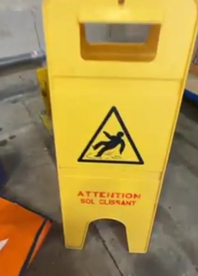 yellow wet floor warning sign labeled "ATTENTION SOL GLISSANT