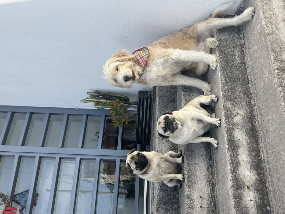 Three dogs pose on concrete steps outdoors. A light-brown, shaggy dog wearing a plaid collar lies at the top of the steps, facing the camera. Below, a pug with a black muzzle sits looking up. Further down the steps is another pug, also with a black muzzle, facing forward. A blue-gray window frame with glass panes is behind the lower pug, next to a potted cactus. The wall behind the dogs is pale blue.