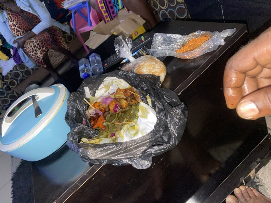 This image presents an indoor scene within a domestic residence in Jos, Nigeria. A dark, possibly wooden, rectangular table occupies the central and foreground areas. On this table, a black plastic bag serves as a container for several skewers of grilled meat (suya) mixed with slices of red onion and green leaves, resting on white paper. To the left of the bag, a light blue and white insulated food warmer with a silver handle is present. To the right, a round, light-brown bread item, partially wrapped in clear plastic, is visible, alongside a smaller clear plastic bag containing orange-red granulated spice. In the immediate foreground, a dark-skinned hand, appearing oily with a reddish stain on the thumb, suggests recent handling of the food or spice. A bare, dark-skinned foot is partially visible on the tiled floor beneath the table to the lower left. On the table's right side, multiple dark-colored remote controls are scattered near two small, clear plastic water bottles. The background reveals a person seated on a sofa with a leopard-print and geometric pattern, wearing a light-colored top over a leopard-print garment. Various household items, including a pink plastic container, cardboard, and assorted fabrics, are present, indicating a lived-in environment. The overall scene depicts an informal meal setting.