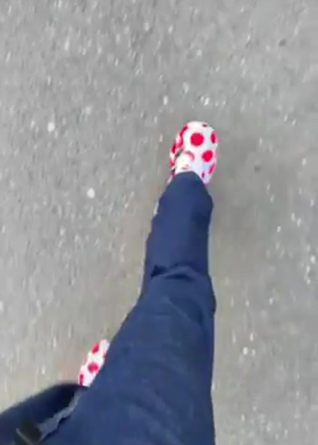 person walking on a gray concrete or asphalt surface. The camera is positioned to view the person's legs and feet from above, looking downward. The person is wearing blue jeans and white shoes with red polka dots. A black bag hangs from one shoulder. The person walks forward throughout the video. The surface they are walking on appears to be a sidewalk or paved path.