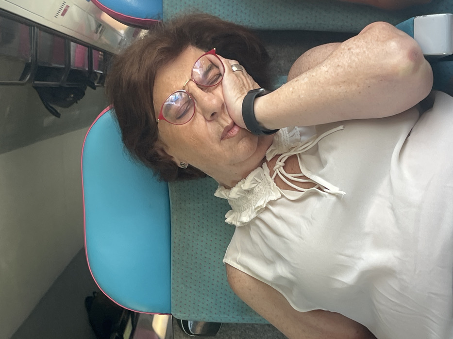A woman with brown hair is sleeping on a bus. She is wearing a white sleeveless blouse, red-rimmed glasses, and a black watch on her left wrist. Her head rests on her left hand. She is sitting in a blue and green bus seat, with a pink stripe at the top. The bus interior is gray and the seat is covered in a green patterned fabric. The bus is located in Eckartswiller, France at coordinates (latitude: 48.769, longitude: 7.316).