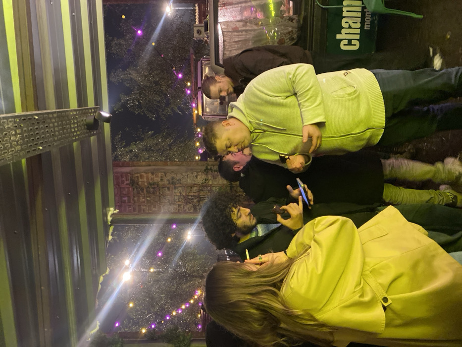 A group of people gather outdoors at night. String lights illuminate the scene. One man in a black coat holds a phone. Another man wears a light green hoodie. To their right, a man in a dark brown coat looks downwards. A woman in a yellow jacket is in the foreground, seemingly smoking. The background includes a metallic structure and greenery.