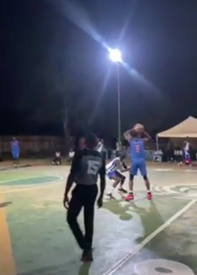 basketball game at night on an outdoor court. A tall light pole illuminates the court. Players wearing blue and white jerseys are actively playing. A referee in black pants and a grey shirt with the number "15" on the back is standing on the sidelines. Several people are sitting or standing around the court, watching the game. A white tent is visible in the background. The court's surface is green with geometric patterns.