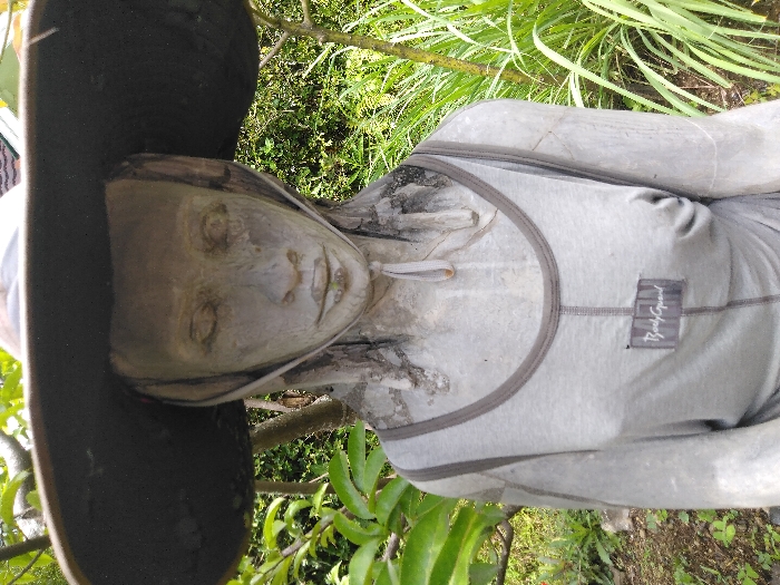 A weathered, light grey concrete or stone sculpture of a female figure is positioned outdoors in Ba Nwet Kone, Myanmar. The sculpture, seen from the chest up, wears a dark, wide-brimmed hat and a light grey long-sleeved top with a dark grey trim around the neckline and a vertical seam down the center front. A rectangular patch displaying the word "BodyGuard" in a dark cursive-style font is affixed to the upper left chest. The figure's face features closed eyes, a straight nose, and closed lips, with a light grey hood-like element framing the face and extending down the neck. The background consists of vibrant green foliage, including broad leaves on the left and tall, slender leaves on the right, under natural daylight.