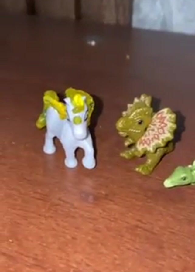 three small toy figurines on a wooden surface. The figurine on the left is a white horse with a yellow mane and tail. The other two figurines are green dinosaurs. The first dinosaur is a Dilophosaurus, standing with its frill visible. The second dinosaur is a Stegosaurus. The wooden surface appears to be a table or desk. A wall is visible in the background.