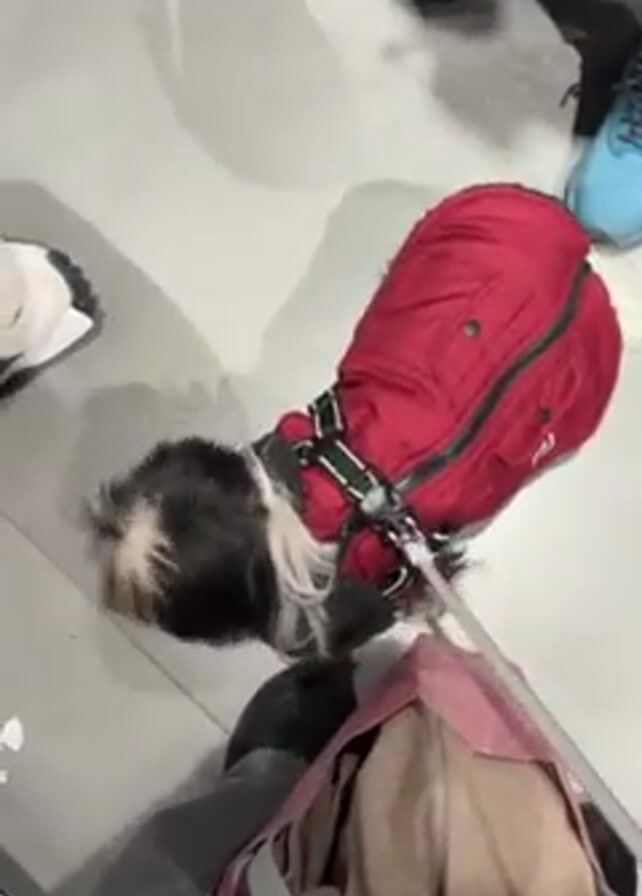 A small dog in a red coat stands on a tiled floor surrounded by people. The dog is black and white and has a leash attached to a harness under the coat. Some of the surrounding people's feet are visible, wearing sneakers or shoes. The person filming is seated.