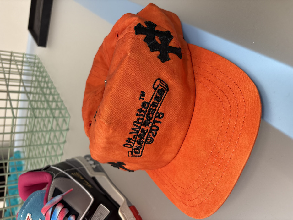 This close-up image captures luxury fashion accessories displayed on a clean, light-colored surface, indicative of a high-end retail environment in Paris, France. The primary subject is an orange baseball cap, featuring prominent black embroidery on its front panel that reads "Off-White™ Chrome Hearts ©2018" encased within a stylized banner. The cap's sides are adorned with embroidered black stylized crosses. To the upper left, the partially visible upper portion of a multi-colored Louis Vuitton sneaker is present, showcasing black, gray, and blue exterior panels, a pink interior lining, and distinctive blue and pink gradient laces. The items are situated on a white or light gray display surface, which features a diagonal light blue stripe or panel. In the background, a light green wireframe display basket is visible to the upper left, and a dark rectangular object, possibly a tray or box, is seen to the upper right. No individuals are visible in the scene, and no actions or interactions are depicted; the objects are static display items.