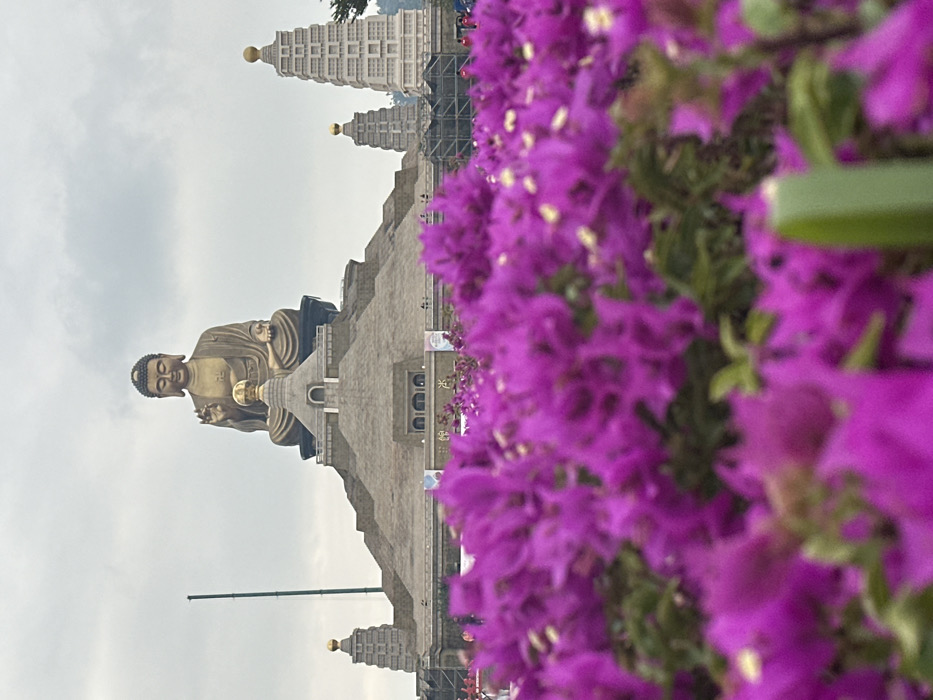 A large bronze Buddha statue sits atop a multi-tiered stone platform. In the background, a towering pagoda structure rises into a cloudy sky. The foreground is filled with bright pink bougainvillea flowers, creating a vibrant contrast to the muted tones of the statue and architecture. The scene evokes a sense of tranquility and spiritual reverence.