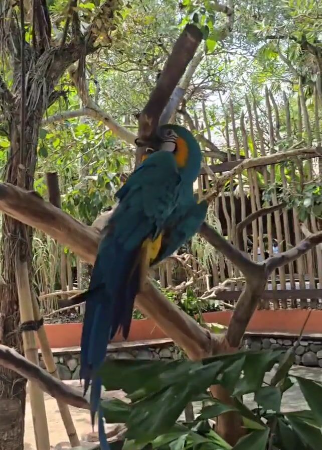 two blue-and-yellow macaws perched on a tree branch. The macaws are grooming each other's feathers. The background includes trees, a wooden fence, and other foliage. People can be seen walking by in the background.