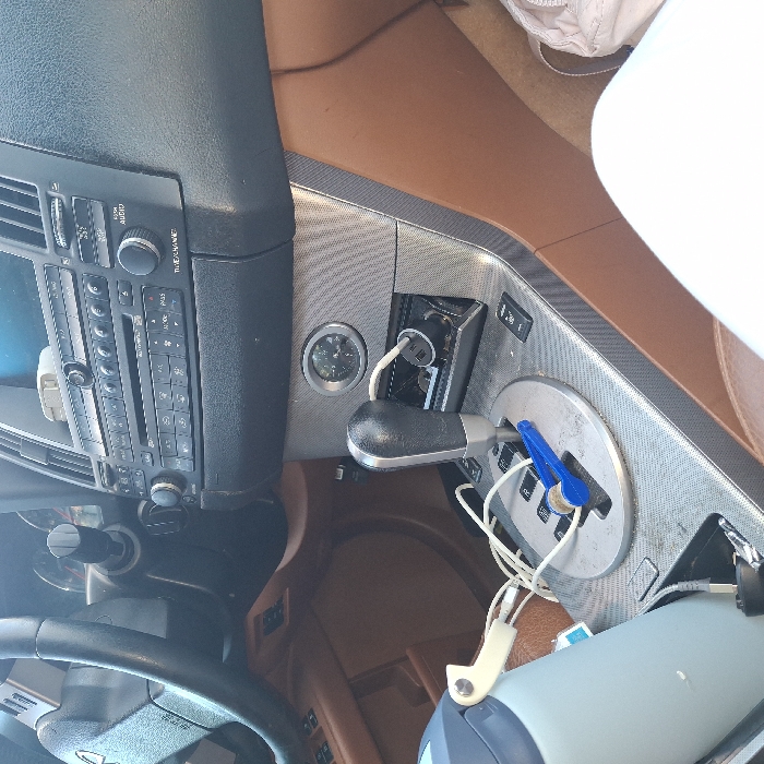 The car's center console features a black dashboard with radio and climate controls. To the right, a silver textured panel houses the gear shift, a compass, and a power outlet with a charging cable. The gear shift has a black handle, and blue clothespins are clipped to it. Cables and cords are tangled around the gear shift area. Tan leather seats are visible. The steering wheel is black.