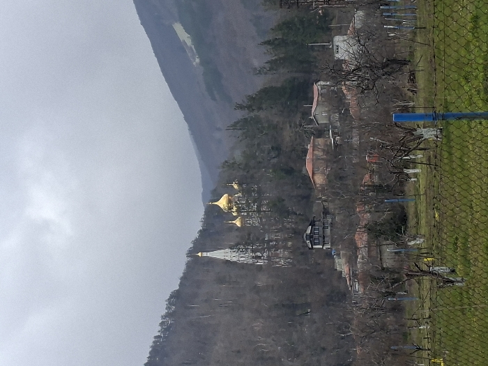 The image displays the Shipka Memorial Church (Nativity of Christ Church) on a wooded hillside near Shipka, Bulgaria, under a uniformly overcast grey sky. In the immediate foreground, a chain-link fence stretches across the lower portion of the frame, separating the viewer from a green grassy field. This field contains numerous bare deciduous trees, possibly an orchard, with many trunks and lower branches painted white, and some supported or marked by blue stakes. Further into the midground, a collection of residential buildings with terracotta-colored roofs and varied architectural styles is visible on terraced terrain, interspersed with sparse vegetation. Prominently in the background, situated higher on a densely wooded slope, stands the Shipka Memorial Church, characterized by its multiple golden onion-shaped domes and a tall, slender, silver-colored spire culminating in a golden finial. The church is partially enshrouded by bare deciduous trees on the hillside. Steep, forested mountain slopes with a mix of bare trees and some conifers flank the scene on both sides, extending into the distance. No individuals, specific actions, or interactions are discernible within the frame.