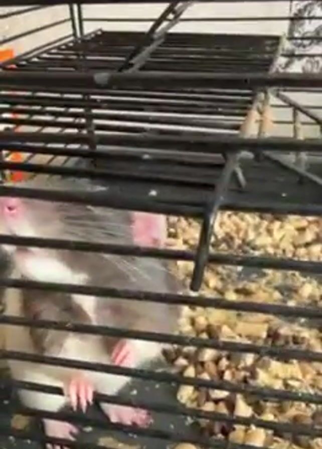 A rat is in a black wire cage