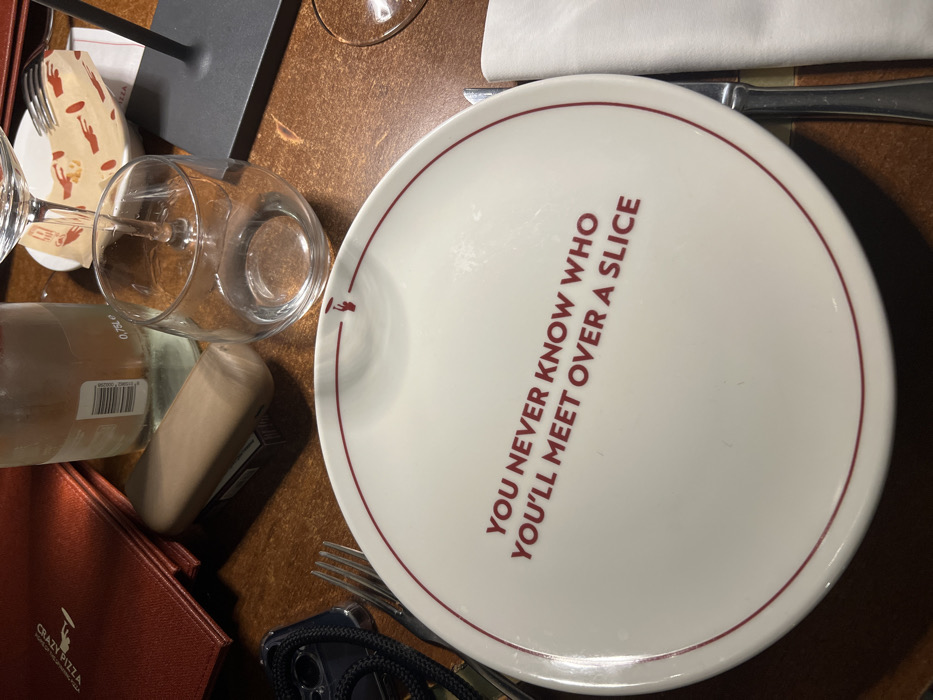 The image displays a close-up, high-angle view of a set dining table at a Crazy Pizza restaurant in Rome, Italy. The central focus is a white round plate with a thin red rim, featuring the red capitalised text "YOU NEVER KNOW WHO YOU'LL MEET OVER A SLICE." A small red logo, resembling a stylized hand, is positioned within a notch at the top of the plate. To the left of the plate, a silver fork is visible, alongside a black lanyard attached to a smartphone case, partially showing camera lenses. Further left, a red menu cover with "CRAZY PIZZA" branding is present. Resting near the menu are a beige, elongated object (possibly a glasses case) on top of a dark rectangular item (possibly a cigarette pack), and a clear glass water bottle labeled "0,75L." To the upper right of the plate, an empty clear tumbler glass is visible, partially obscured by the base of a clear stemmed wine glass. Beneath the wine glass, a white paper wrapper or napkin with repeating red hand motifs is present. A dark grey or black object, consistent with a lamp base, stands in the upper right quadrant. To the right of the plate, a silver knife and a folded white cloth napkin complete the place setting. The table surface is dark brown with a textured, possibly wooden, finish. No individuals are depicted.