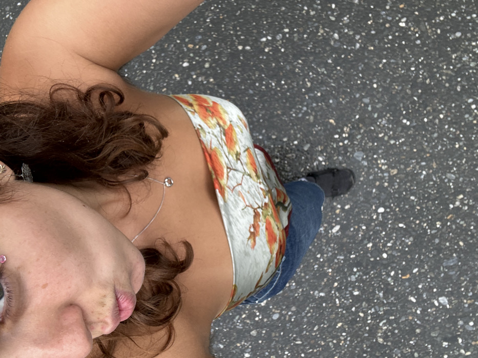 An overhead photograph depicts a female individual standing on a dark, speckled asphalt surface. The subject's upper body is visible, angled downwards and to the left. She has dark, curly hair and a tanned complexion with visible freckles on her right cheek. Her right eye is partially visible, adorned with a pink gemstone below the outer corner. Her lips are pursed, and she wears a silver-colored earring with an ornate design in her right ear. A thin silver-colored chain necklace with a small, circular pendant is visible. She is dressed in a strapless top featuring a light background with an orange and brown floral pattern, blue denim jeans, and a single black shoe on her right foot. The scene is located in Xiulin, Taiwan.