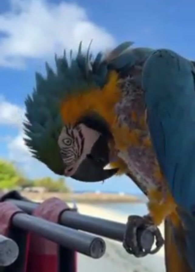 blue and yellow macaw parrot perched on a metal bar. The parrot is preening its feathers, looking down, and appears to be missing feathers around its chest. Behind the parrot is a beach with white sand and blue water, with trees in the distance. The sky is blue with some scattered clouds. The parrot is the main focus of the shot.