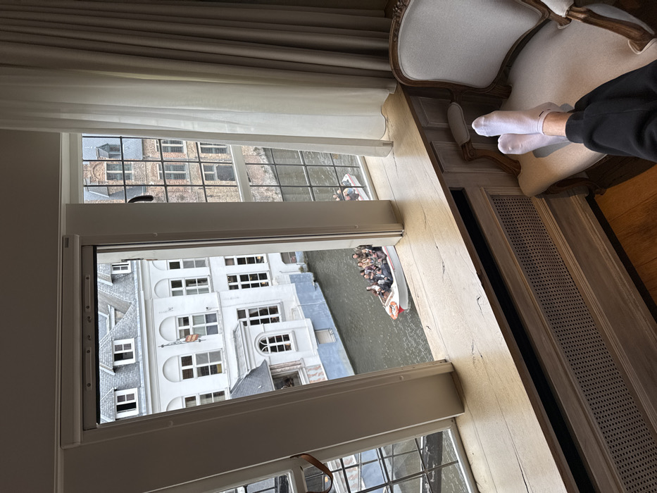 The image depicts an indoor scene looking out a window onto a canal in Bruges, Belgium