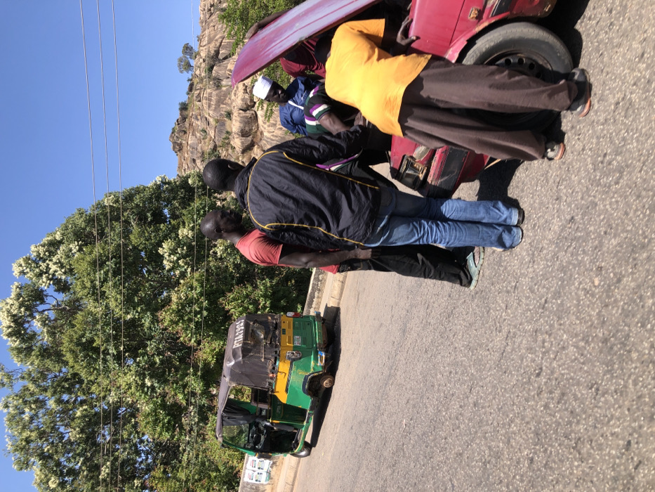 The image depicts a roadside scene in New Stadium, Nigeria, under a clear blue sky