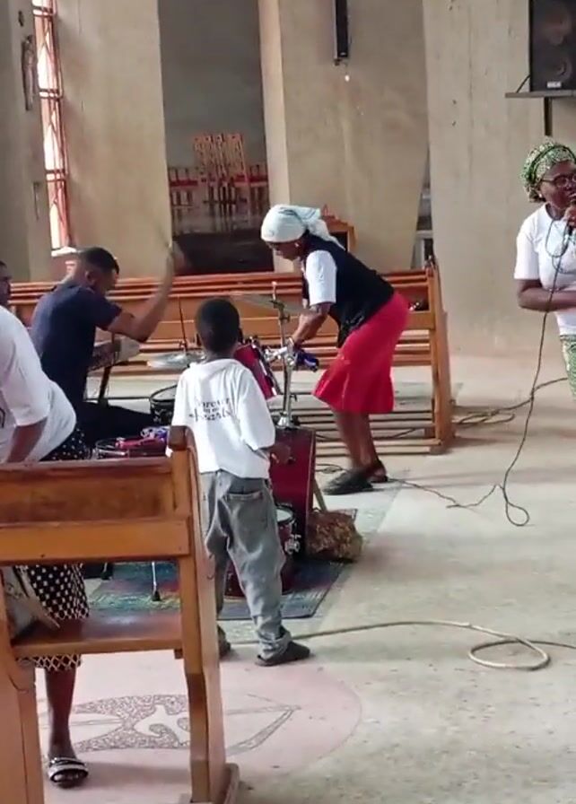 The video depicts an interior shot of a church where a band seems to be rehearsing. Several adults are present, along with a young boy who stands in front of the drum kit. A woman dressed in a white headscarf, black vest, and red skirt sings into a microphone, while a man in a blue shirt plays what appears to be a keyboard behind the drums. Two other adults are partially visible seated in church pews. The overall atmosphere suggests preparation for a musical performance or church service.