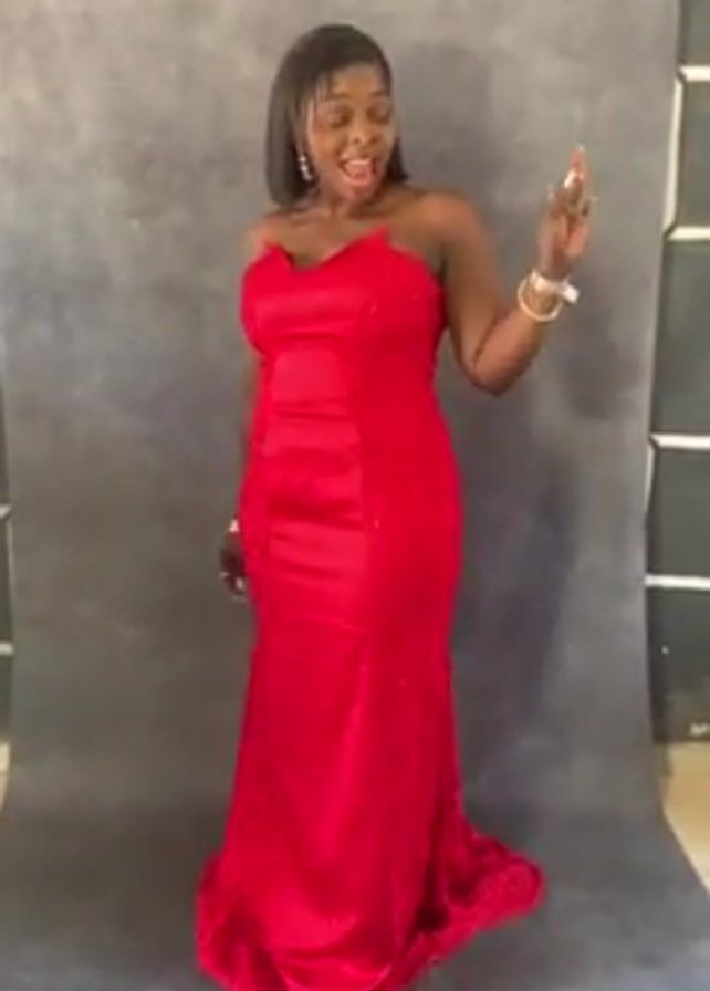 A medium-shot video shows a woman in a red strapless gown. She has dark skin and wears her black hair in a shoulder-length bob. She is adorned with dangling earrings, gold bangles on both wrists, and rings on her fingers. Her nails are painted white. She stands against a mottled grey backdrop, with a portion of a white wall with vertical indentations visible to the right. Throughout the video, she gestures with her hands and looks to the left and right, exhibiting a variety of facial expressions, including smiles and expressions of surprise. The woman appears to be speaking, although the audio is not described. The gown she wears is fitted, flares slightly at the bottom, and features a panel of textured fabric on each side of a smooth, satin-like central panel.