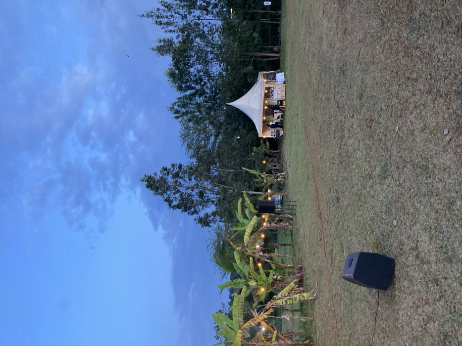 The scene depicts an outdoor event space at twilight within Murera ward, Kenya. A large, open grassy field occupies the foreground and mid-ground. In the immediate foreground, a black, wedge-shaped audio speaker rests on the ground. A dark cable extends from this speaker towards the right. To the left and slightly further back, a cluster of banana plants is illuminated by a string of warm-toned bulb lights. Another black speaker, mounted on a stand, is visible among these plants to the left of the main tent. The central feature is a cream-colored, rectangular tent with a distinctive conical peak, situated in the mid-ground. The interior of this tent is brightly lit, revealing what appears to be a service or bar area with multiple tables. Approximately three to four individuals are visible inside and immediately in front of the tent, engaged in activity suggestive of an event or gathering. The background consists of a dense line of tall trees, primarily appearing as slender-trunked evergreens or similar species, forming a natural perimeter. The sky above is a deep blue, indicative of dusk or early evening, with scattered, darker clouds. Faint, distant lights are visible among the background trees.
