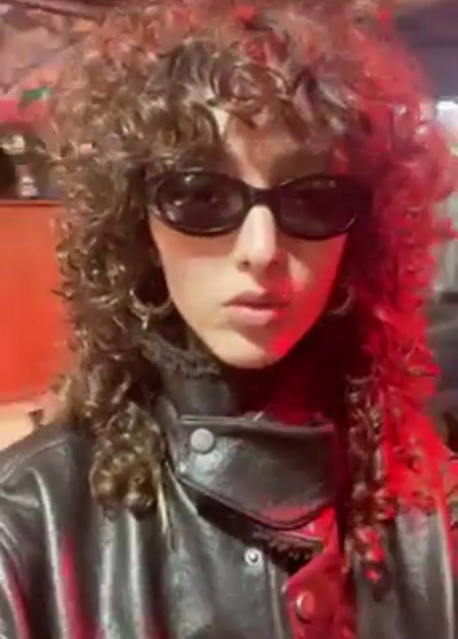 The video presents a person from the chest up. The individual has fair skin, curly reddish-brown hair, and is wearing black sunglasses and a black leather jacket. They are indoors, possibly in a restaurant or a cafe, as suggested by the background which shows glimpses of decorations and furniture. The scene is illuminated with a red light, creating a strong contrast on the person’s face and jacket. The individual stands relatively still, facing the camera directly, with minimal movement throughout the video.