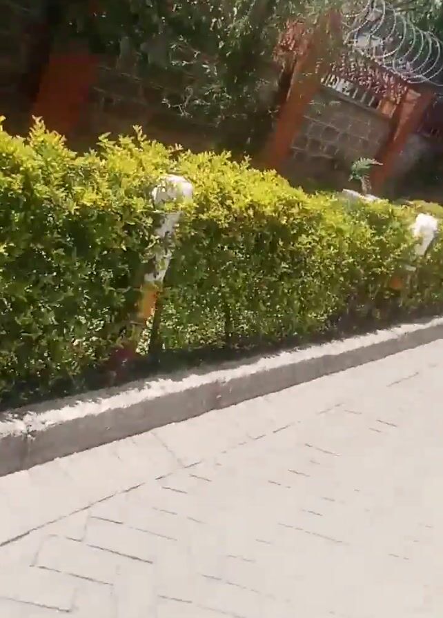 view from a slightly elevated perspective, looking down at a brick walkway. To the right is the walkway, which is made of light gray bricks. To the left of the walkway is a thick hedge of green bushes. Behind the hedge is a brick wall with some barbed wire visible on top. There are also some trees in the background. The lighting is bright and sunny. The camera appears to be moving slightly, giving the impression of someone walking along the path. There are a couple of white and yellow objects among the bushes, possibly plant pots or decorative elements.