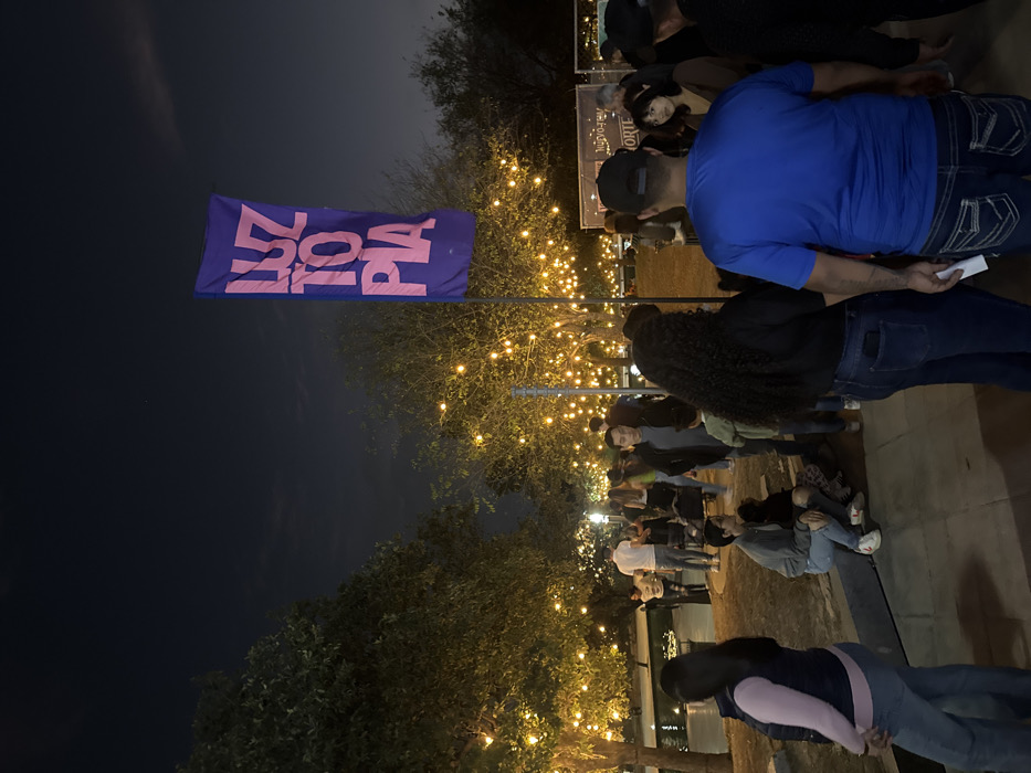 A nighttime outdoor scene features a crowd gathered under string lights. A blue banner with pink lettering is visible in the foreground. People are wearing casual clothing, including jeans, t-shirts, and jackets. Some individuals hold papers in their hands. Trees frame the left side of the image, contributing to the ambiance of the outdoor event.