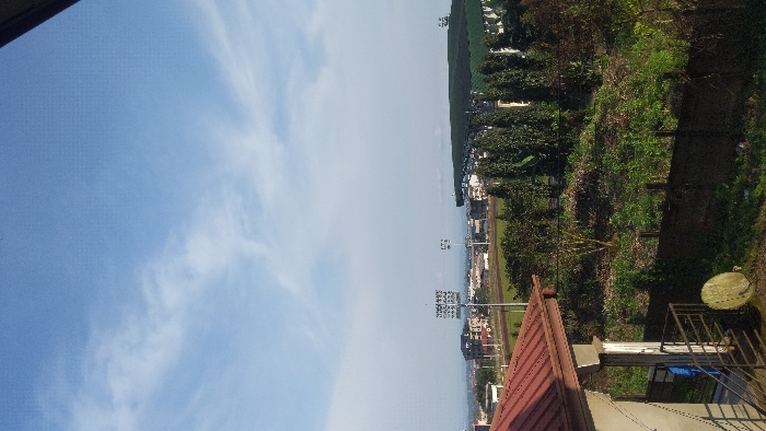 An elevated, static scene captures a daytime panorama in Buea, Cameroon, under a partially cloudy, light blue sky. In the immediate foreground, to the left, a portion of a building is visible, featuring a reddish-brown corrugated metal roof and a light-colored exterior wall. Metal stairs with a railing descend from the structure, where a blue fabric object hangs. A light-colored circular satellite dish rests on the ground near the stairs. The midground consists of an overgrown, green vegetated area, interspersed with sparse bushes and some visible soil. A low, dark wall or fence partially recedes into this vegetation. Further back, a line of tall, dark green columnar trees stands. The background is dominated by a large sports complex, identified as the Buea Omnisport Stadium. It features a green playing field, a prominent dark-colored grandstand with a roof, and several tall light towers equipped with multiple floodlights. Beyond the stadium, an urban landscape unfolds, displaying various residential and commercial buildings. Patches of exposed reddish-brown earth are discernible among the structures, suggesting development or open land. No individuals or active events are depicted in the scene.