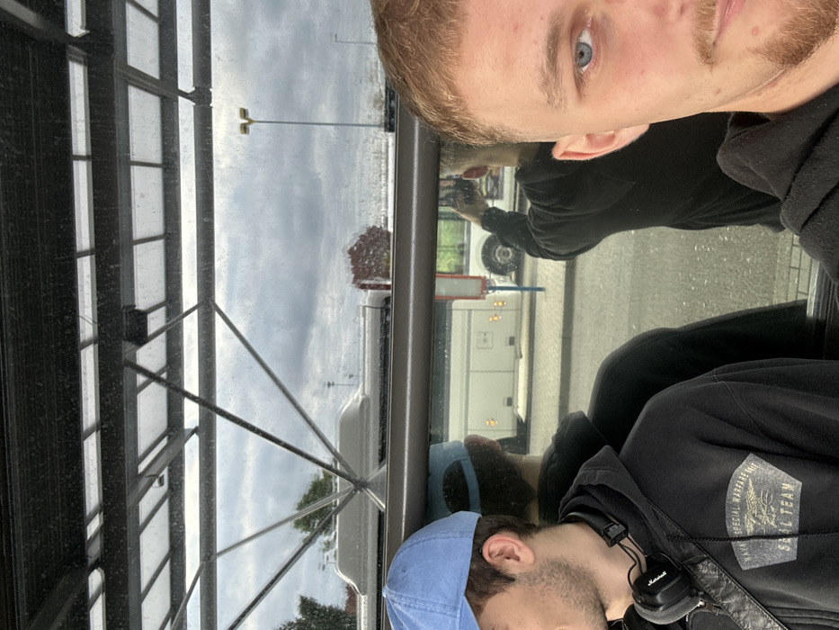 The image depicts a selfie taken from inside a covered structure, likely a bus or tram shelter, in Illkirch-Graffenstaden, France, on an overcast day. In the foreground, two male subjects are visible. The subject on the right, partially cropped, has light blue eyes and light facial hair, looking directly into the camera; his reflection in the window shows him holding a smartphone to capture the image. The subject on the left, viewed from the chest up and facing left, wears a light blue baseball cap and a dark hooded jacket with "NAVY SPECIAL WARFARE UNIT SEAL TEAM" printed on it. Black Marshall headphones are around his neck. Through the rain-speckled window, an exterior scene is visible. A large white bus is parked or stopped on a paved surface. Adjacent to the bus is a red and white pole-mounted sign, likely indicating a stop. The background features a grey, cloudy sky. Several tall streetlights with distinctive 'Y'-shaped tops are present, along with a tree displaying reddish-brown foliage. The interior overhead structure, composed of metal framing and translucent panels, is visible above the window.