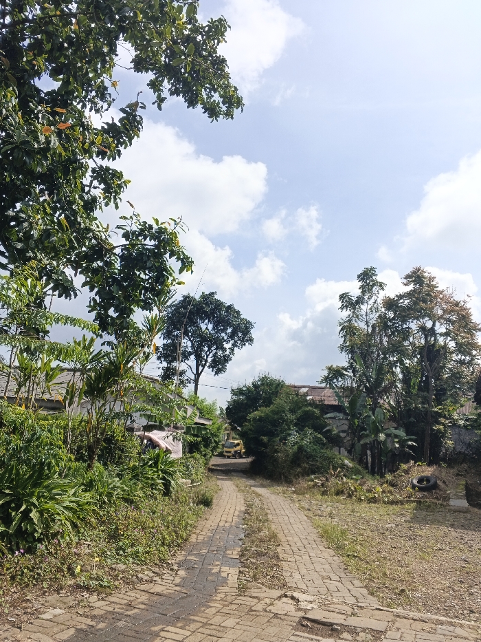 A brick path leads the eye down a rural lane towards a small yellow truck. Lush green vegetation flanks both sides, with tropical plants and trees reaching for the partly cloudy sky. A building, partly obscured by plant life, sits to the left of the path, while a tire rests on the ground to the right. The scene is bathed in natural light, conveying a sense of quiet countryside.