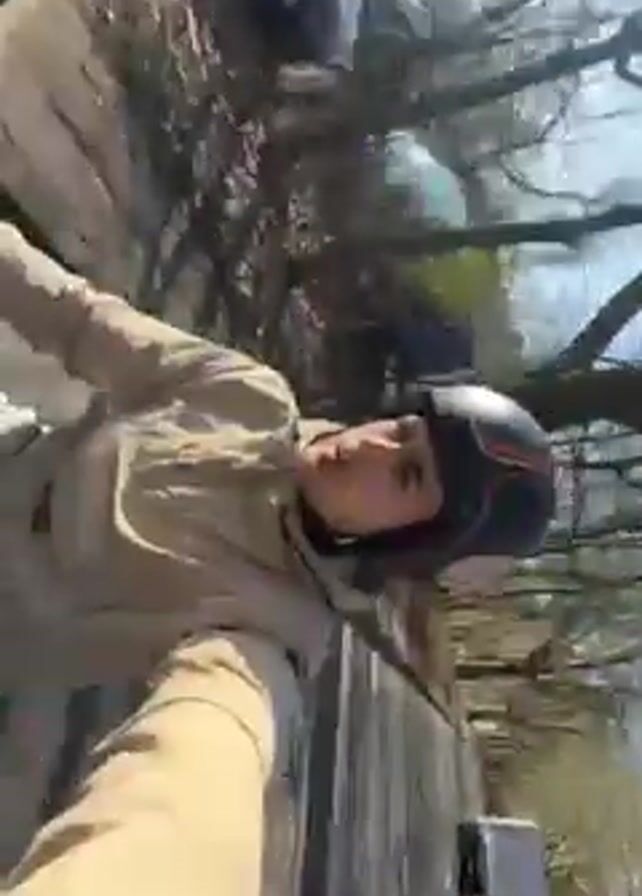 A young man wearing a helmet and a beige jacket rides a scooter down a road. The video appears to be taken with a camera attached to the helmet. The camera rotates throughout the video. The road has sidewalks on either side, and parked cars are visible along the edges. Trees without leaves are also visible in the background. The sky is clear and blue. The scooter's dashboard is visible, showing the handlebar, rearview mirror, and controls. At one point, the camera points downward to show the rider's jeans and red and white shoes. The overall impression is of a casual, first-person perspective of someone riding a scooter on a sunny day.