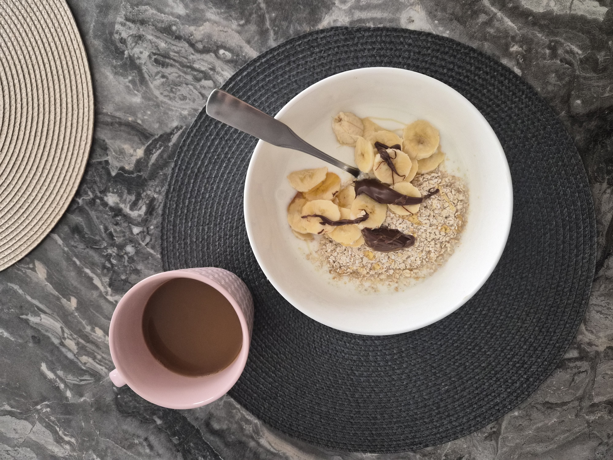 An overhead view captures a breakfast setting in Plovdiv, Bulgaria, arranged on a dark gray and white marble-patterned tabletop. A dark gray, circular, woven placemat is centrally positioned, supporting a white ceramic bowl. The bowl contains rolled oats, numerous slices of yellow banana, and several irregular dark brown chocolate drizzles. A silver-colored spoon rests within the bowl's contents. To the upper left of the bowl, a pink ceramic mug with a dimpled texture holds a light brown beverage. A partial view of a second circular, woven placemat, light beige in color, is visible in the upper right corner, resting on the marble surface. No individuals are present in the scene.