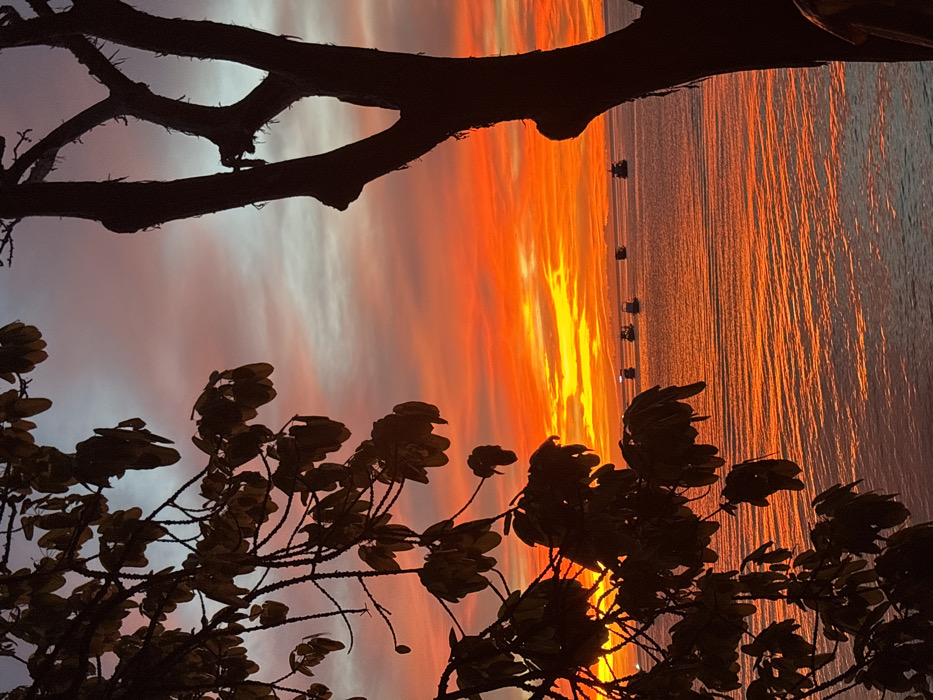 The image depicts a sunset or sunrise over the ocean in Tambon Ko Tao, Thailand. The sky is dominated by intense orange, red, and yellow hues near the horizon, transitioning to pink, light orange, and pale blue-grey higher in the frame. Silhouetted tree branches with visible leaves extend from the left side, obscuring the upper-left sky and part of the vibrant horizon. A thick, dark tree trunk, also silhouetted, occupies the right edge of the frame. The water surface reflects the sky's colors, appearing orange with subtle ripples. Six small vessels are visible as dark silhouettes on the water, spaced across the mid-distance. One boat on the far left shows a small, distinct light. A faint, dark landmass is discernible along the horizon line. No individuals or specific actions are identifiable within the scene.