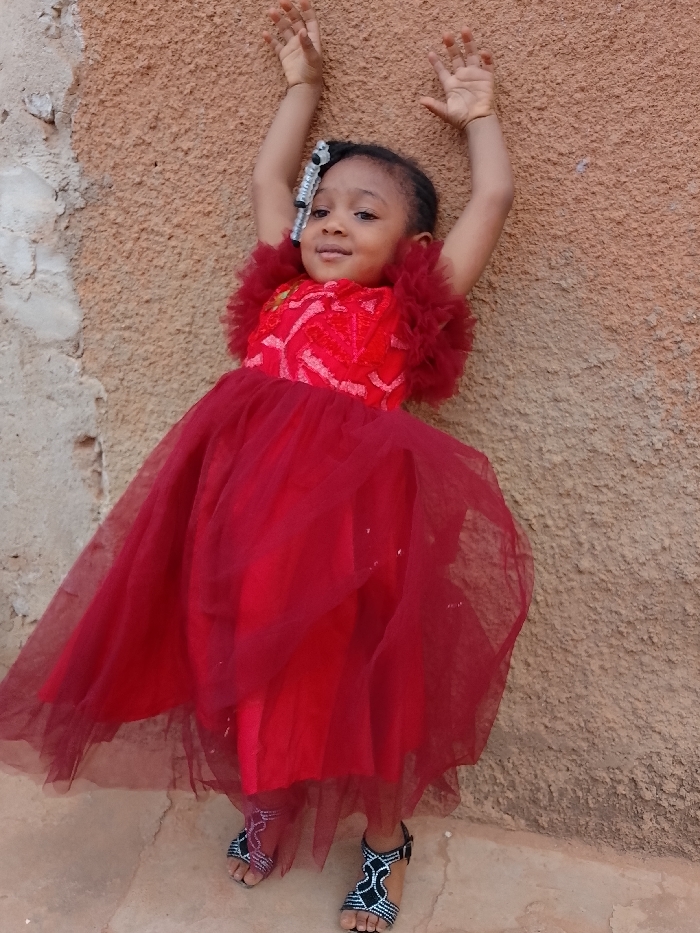 A young child, likely female, stands facing forward with her back against a textured, light brown stucco wall. Her arms are raised vertically above her head, with open palms facing forward. She is wearing a floor-length, vibrant red formal dress. The bodice of the dress is intricately patterned with lighter red and pink geometric designs, featuring ruffled, maroon-colored material at the short sleeves. The full skirt consists of multiple layers of sheer red tulle over a solid red lining. Her dark hair is styled in braids, and a silver-colored, spiral-design hair accessory is visible on the left side of her head. On her feet, she wears black sandals with prominent silver-colored, beaded, or sequined strap designs. The child gazes directly at the camera with a faint smile. The ground beneath her feet is a light-colored, possibly concrete or tiled, surface. The scene is located in Television, Nigeria.