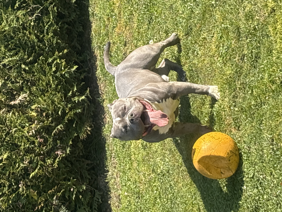 - "An American Bully dog, light grey with white markings on its forehead, chest, and paws, stands on a green grass lawn under direct sunlight" by FM-rEJ0w2, licensed under CC BY 4.0