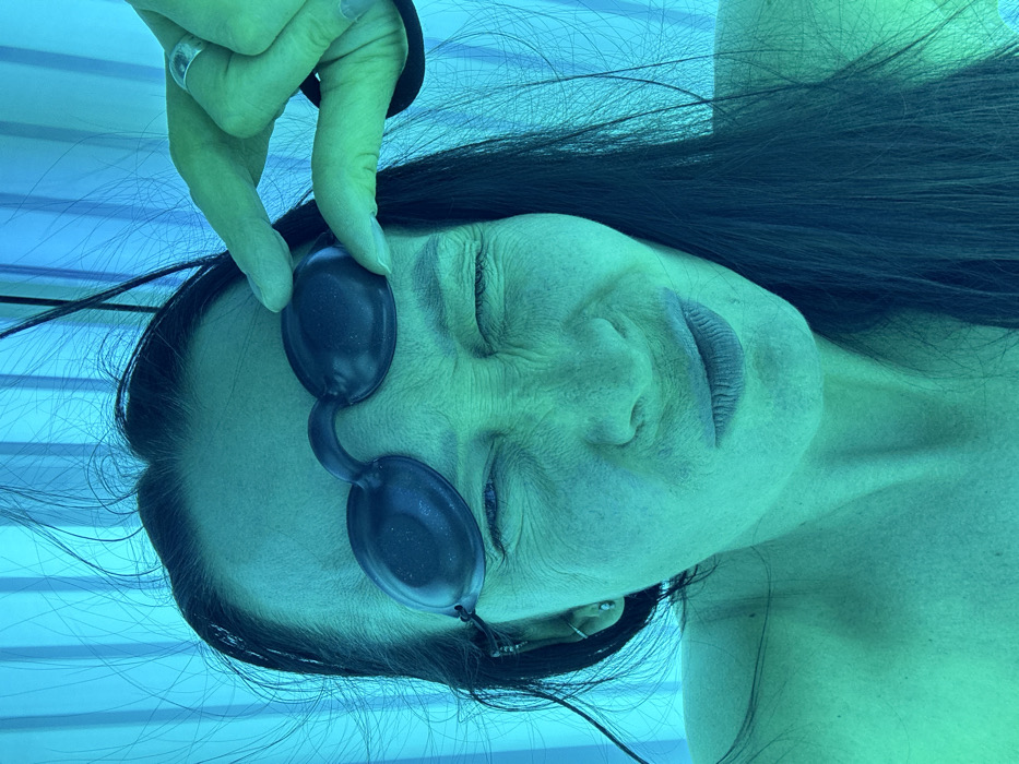 - "A female individual is depicted in a close-up, illuminated by the artificial blue and green light of a tanning bed, located in Chaikovsky, Russia" by FM-kirZf2, licensed under CC BY 4.0