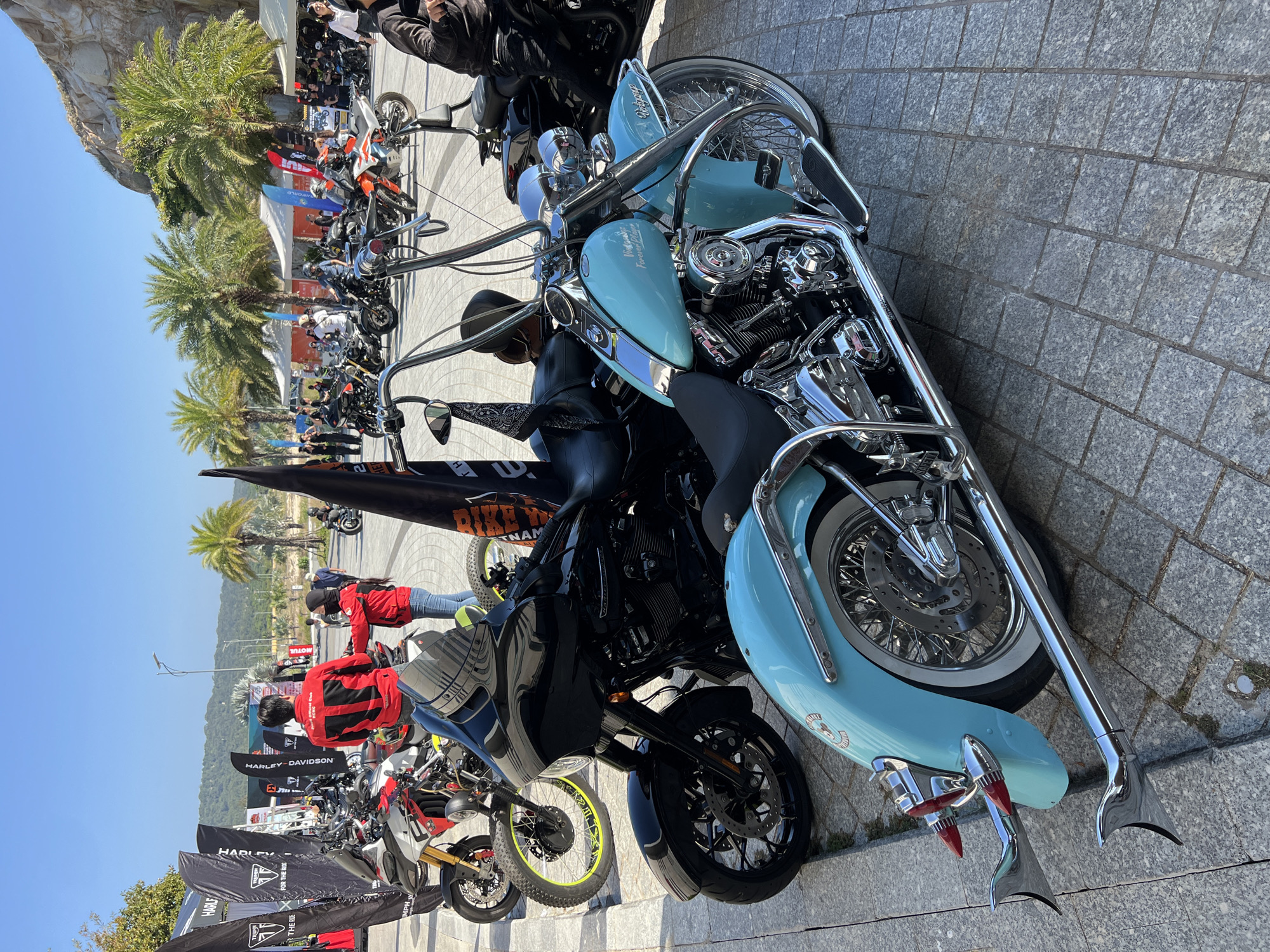The scene depicts an outdoor motorcycle event occurring on a sunny day in Cam Ranh, Vietnam. The foreground is dominated by a customized light blue Harley-Davidson motorcycle with extensive chrome accents, whitewall tires, wire-spoke wheels, distinct flared chrome exhaust tips, and a black solo seat. Its fuel tank and front fender bear partial text including "Vietnam" and "Forever." Directly behind it, a black Harley-Davidson touring motorcycle with a large front fairing and black wheels is partially visible. In the mid-ground, numerous other motorcycles of various makes and models, including a white and red adventure-style bike with a prominent yellow-rimmed front wheel, are parked on grey paver stones. A crowd of people is gathered, observing the motorcycles and interacting. Two individuals in matching red jackets are prominent; one male faces away from the camera, displaying "Vietnam" text on his back, while a female wearing a black face mask faces him, appearing to gesture or converse. Several black banner flags featuring "HARLEY-DAVIDSON" and "TRIUMPH" logos, along with "FOR THE RIDE" text, are displayed throughout the event area. White tents are also set up. The background features a clear blue sky, numerous palm trees, and green, rocky hills under direct sunlight. The ground is paved with interlocking grey granite pavers.