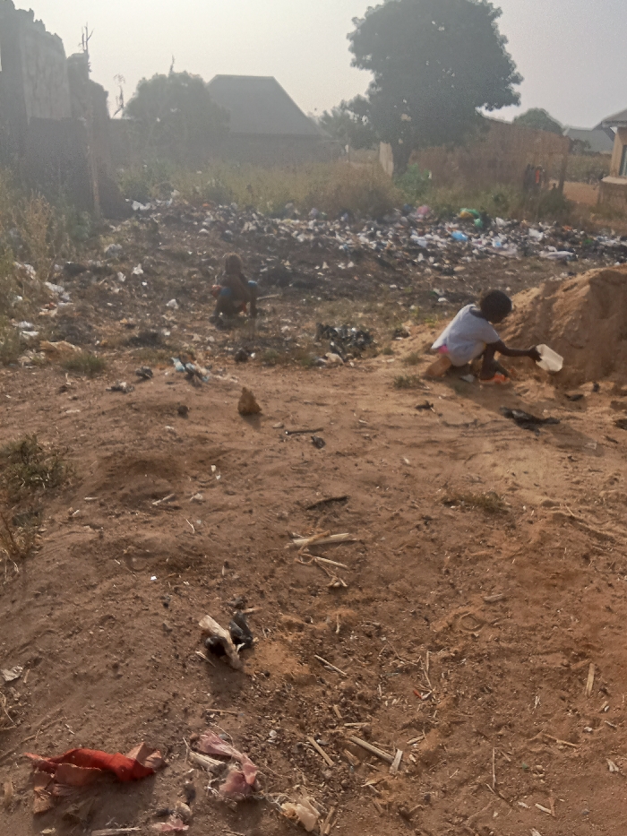 The image displays an outdoor scene in Rido, Nigeria, characterized by an open, unpaved area under hazy daylight conditions. The ground consists predominantly of reddish-brown earth, uneven and sparsely covered with dry vegetation and scattered debris. In the midground, a substantial accumulation of solid waste, including numerous white plastic bags and miscellaneous refuse, forms a mound extending horizontally across the frame. Two children are present in the midground. On the left, a child in dark clothing squats low to the ground amidst scattered debris. On the right, a second child, wearing a light-colored short-sleeved top and dark shorts, squats beside a small pile of reddish-brown sand. This child holds a clear plastic container and appears to be manipulating the sand. Orange footwear is visible on this child's feet. A small, light-colored rock rests centrally between the children. The immediate foreground features bare reddish-brown earth with scattered small pieces of debris, including a prominent piece of red fabric, white refuse, and dry plant matter. In the background, beyond the refuse pile, sparse vegetation, a damaged or incomplete concrete structure on the far left, and a large, mature tree with green foliage on the right are visible. Distant residential rooftops are discernible under a light, hazy sky. No direct interaction between the two children is observed.