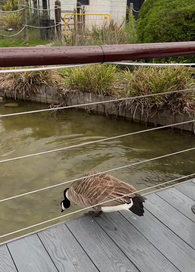 A young man stands on a wooden bridge, looking at his phone. He is wearing a black puffer jacket, white sweatpants, and brown sneakers. He is standing near a railing. A Canadian goose in the water rapidly flaps its wings to move forward. It joins another goose already swimming. There is a duck and another goose visible as well. The water is murky and has a grid pattern on the bottom. A small castle-like structure is visible in the background, along with greenery and trees. The weather appears overcast.