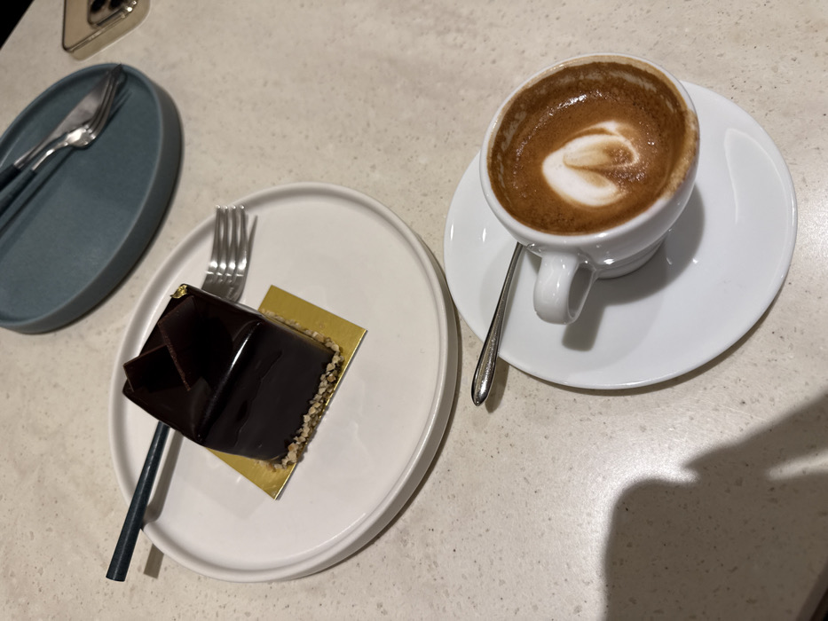 A dark chocolate dessert sits on a white plate next to a fork. Adjacent to the plate is a white cup of coffee with latte art, accompanied by a spoon and saucer. Further left, a blue plate holds a knife and fork. The arrangement is set on a speckled surface, likely a countertop or table, with a shadow appearing at the bottom right.