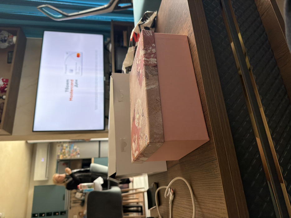 The scene depicts an indoor residential living space, specifically in Panagyurski kolonii, Bulgaria, with a partially visible kitchen area in the background. In the foreground, a dark wooden coffee table holds a light pink rectangular gift box with a patterned lid, positioned in front of a larger, open white cardboard box. To the left of these boxes, a coiled white USB-C cable rests near a partially visible dark smartphone. In the midground, a large flat-screen television displays white text "T-Boow Mastercard Aue" and a Mastercard logo on a white background, mounted above a dark entertainment unit. To the right of the television, a blue fabric office chair and a teal curtain are visible. In the background kitchen area, an individual with light hair, dressed in dark clothing, stands near a table, holding an object to their mouth, suggesting consumption. Blue cabinetry, a white air conditioning unit, and a refrigerator are also present in the kitchen area. The overall lighting is consistent with an indoor environment.