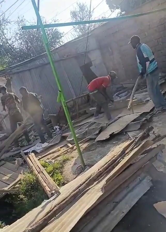 group of men demolishing a structure made of corrugated metal and wood. The men are using hand tools to dismantle the structure, and pieces of metal and wood are scattered around the ground. The scene appears to be taking place in an urban area, with a road and power lines visible in the background. Several people stand by the road watching the demolition.